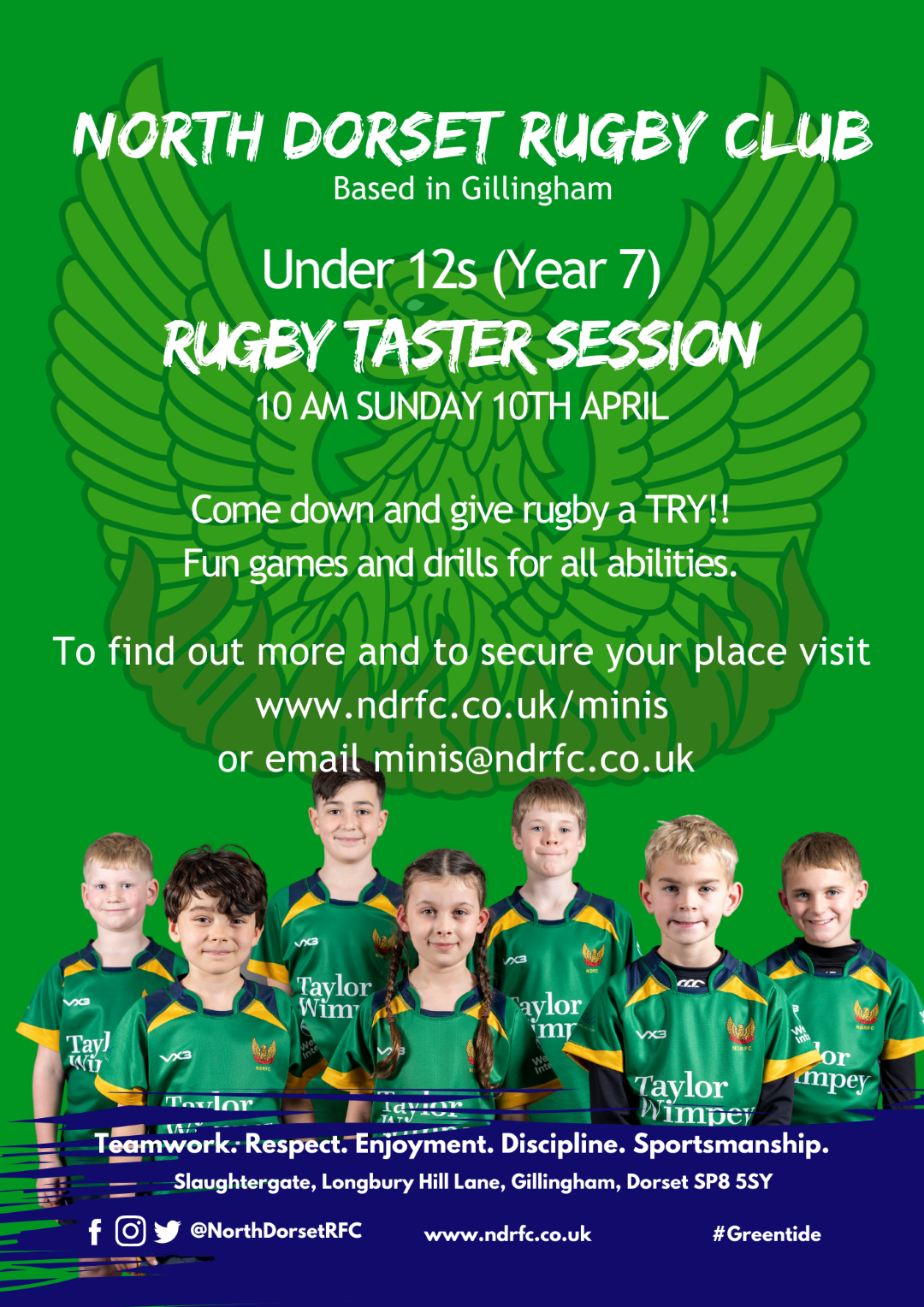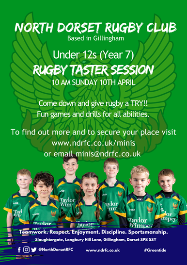 The clubs U12s are hosting a Rugby Taster Session Sunday 10th April.
