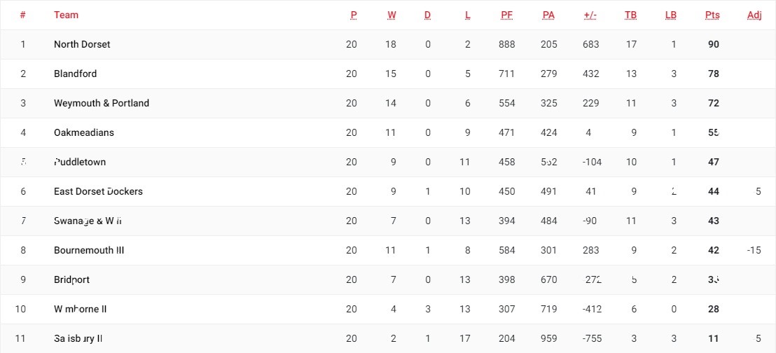 North Dorset have played 22 games this season winning 20 of them. They have scored 968 points and conceded 232, which means their average score this season is 44-11.