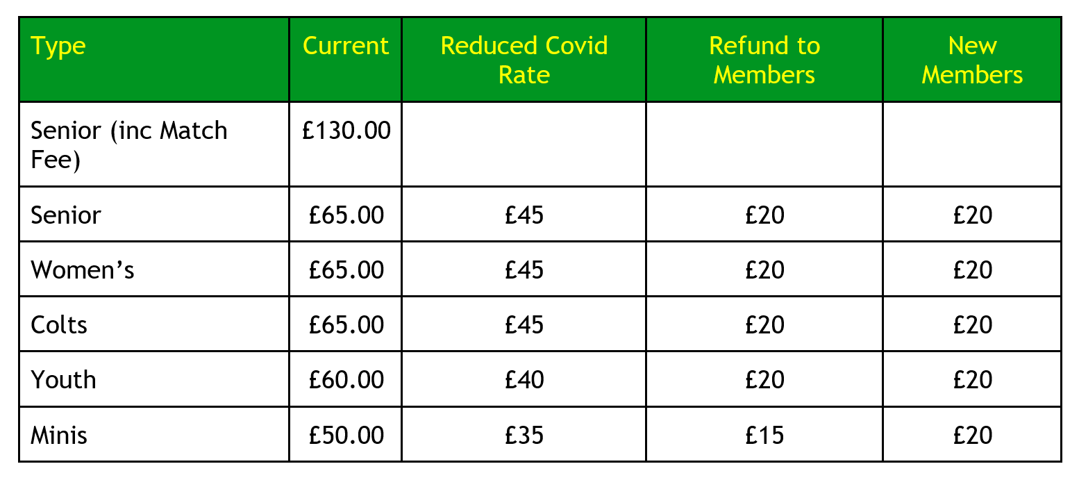 To all those playing members, whether senior or junior, who have paid their membership for the year, we will be offering a partial refund of £20 for Seniors and Youth and £15 for Minis. We hope this will go a little way to compensate for the lack of competitive matches. This refund will be made back onto your club account, which can be used in the bar and shop for any future purchases. You will need to quote your membership number when you make your purchase.