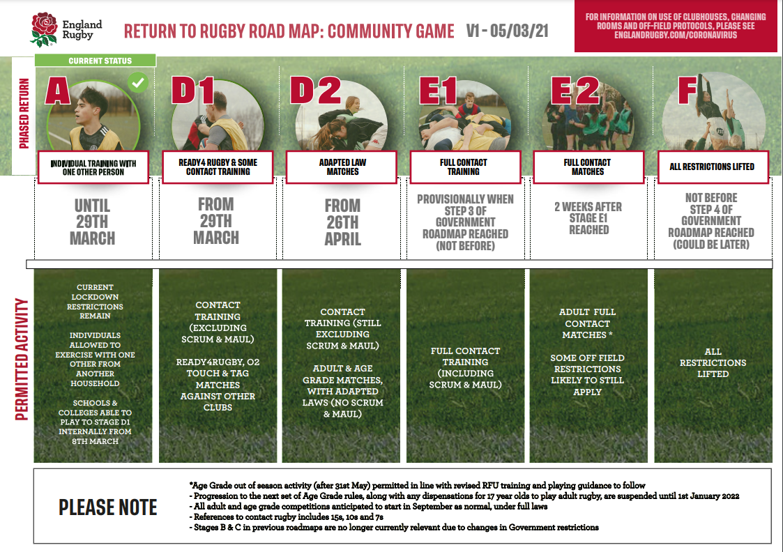 England Rugby have released their Return to Rugby Roadmap, more information can be found here https://www.englandrugby.com/news/article/community-rugby-set-to-return-from-29-march